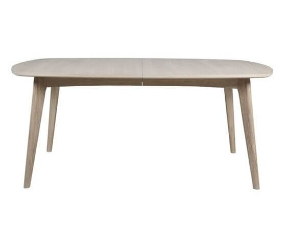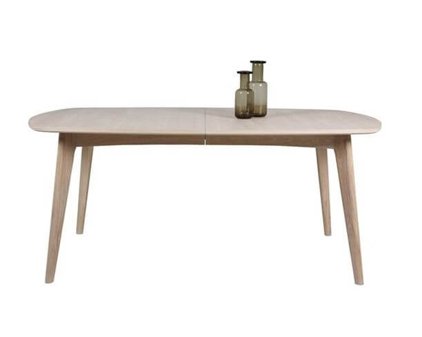 Die Tischplatte ist aus massiver, weiß pigmentierter Eiche gefertigt, dessen Ecken schön abgerundet wurden.