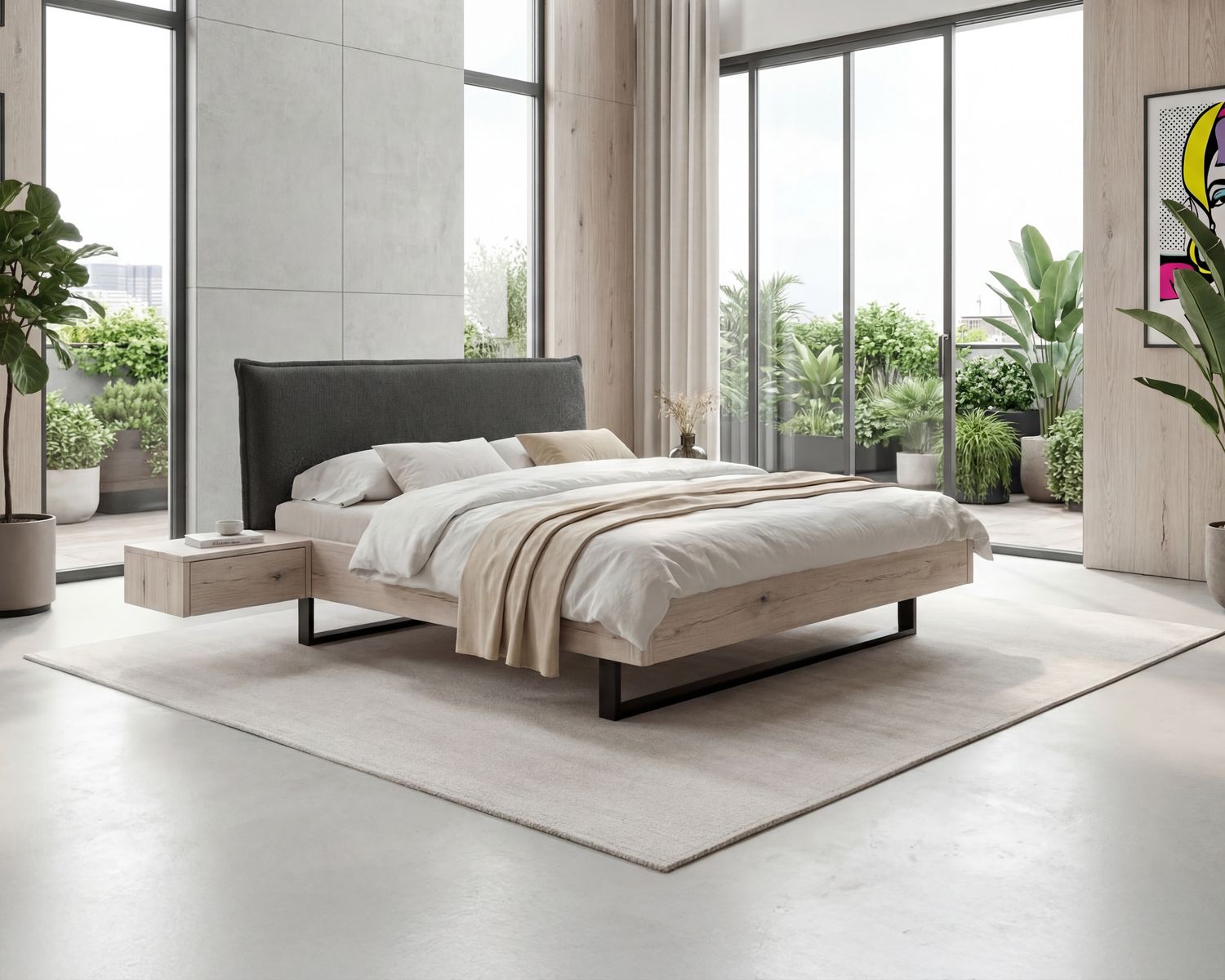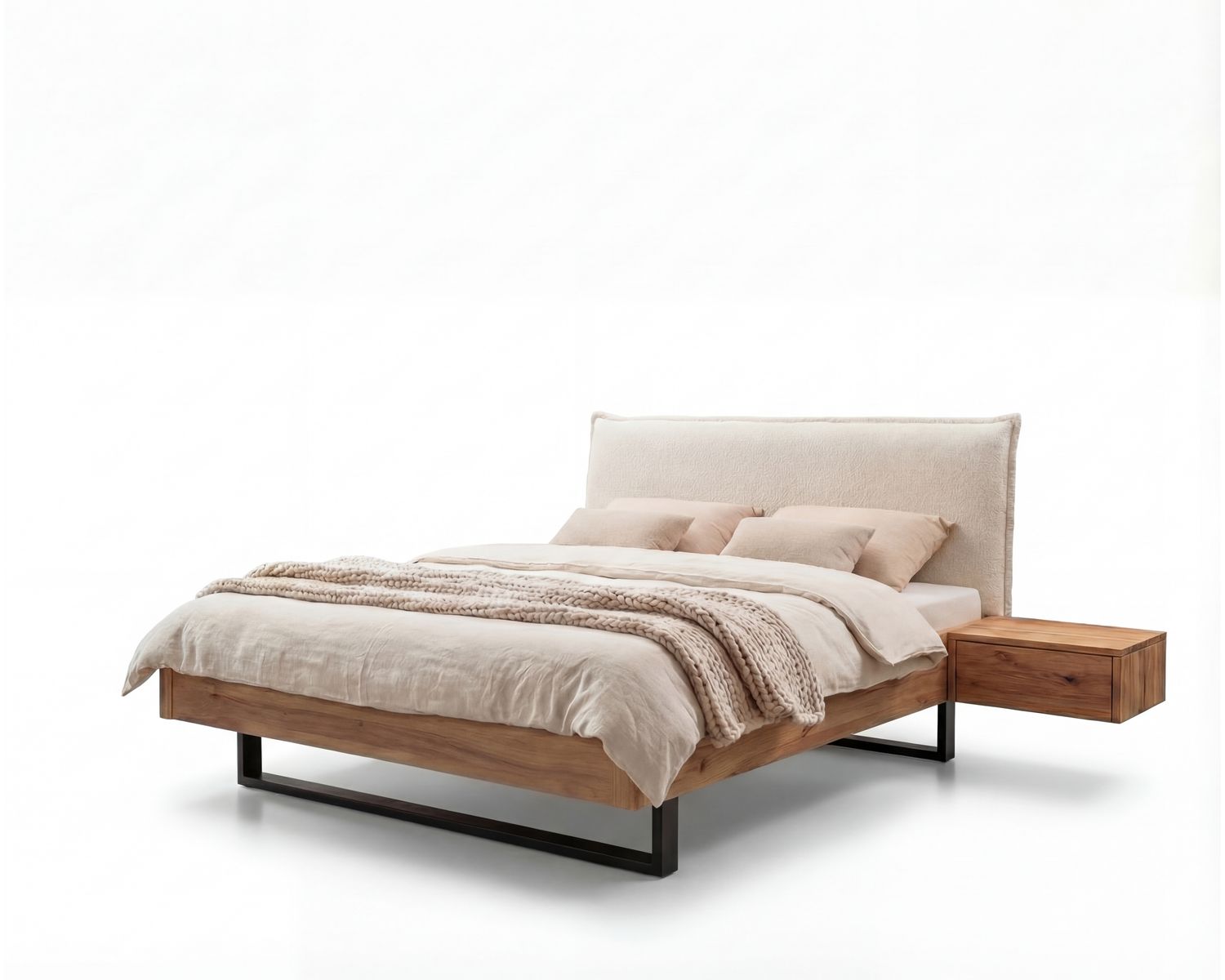 Das Herzstück dieses Modells ist das neu interpretierte Fundament. Der massive Rahmen ruht auf hochwertigen Factory U Kufen aus schwarzem Metall. Diese wirken extrem edel und absolut zeitlos. Sie bilden einen spannenden, modernen Kontrast zur Wärme der Wildeiche und verleihen dem Bett eine geerdete, aber dennoch luftige Optik. Die klare U-Form des Metalls unterstreicht die Geradlinigkeit des Designs, ohne sich in den Vordergrund zu drängen.