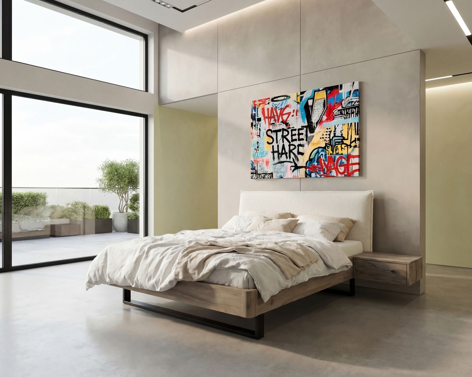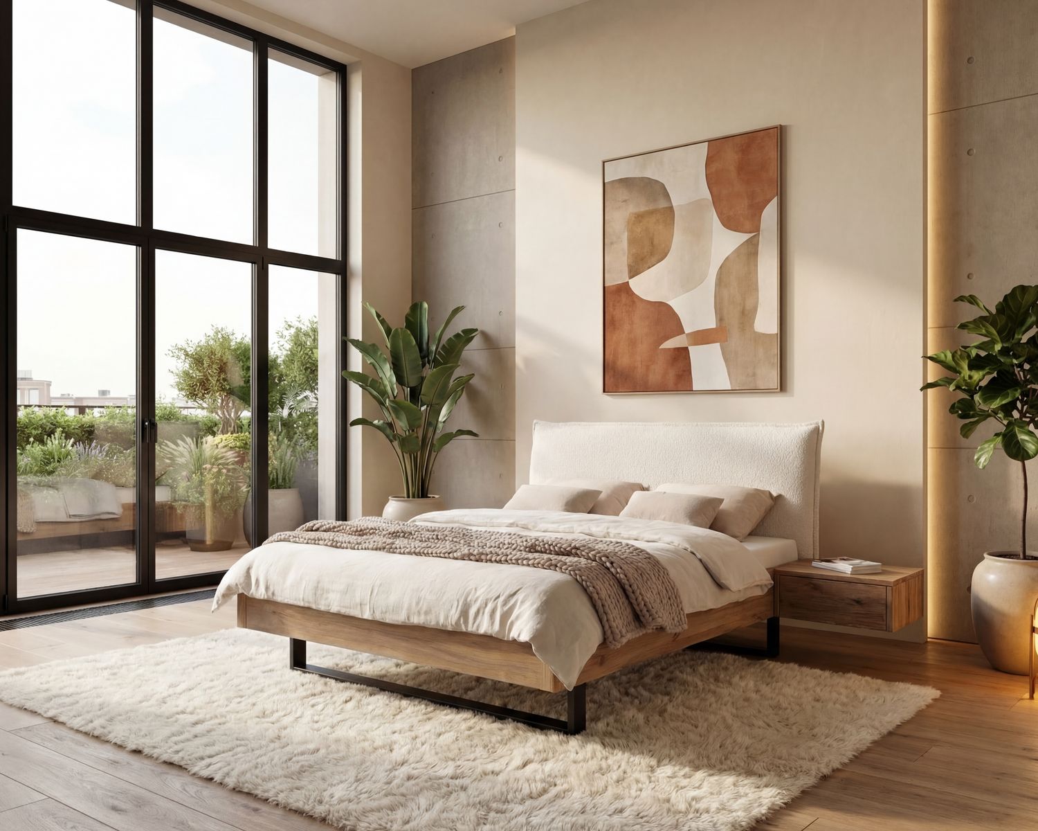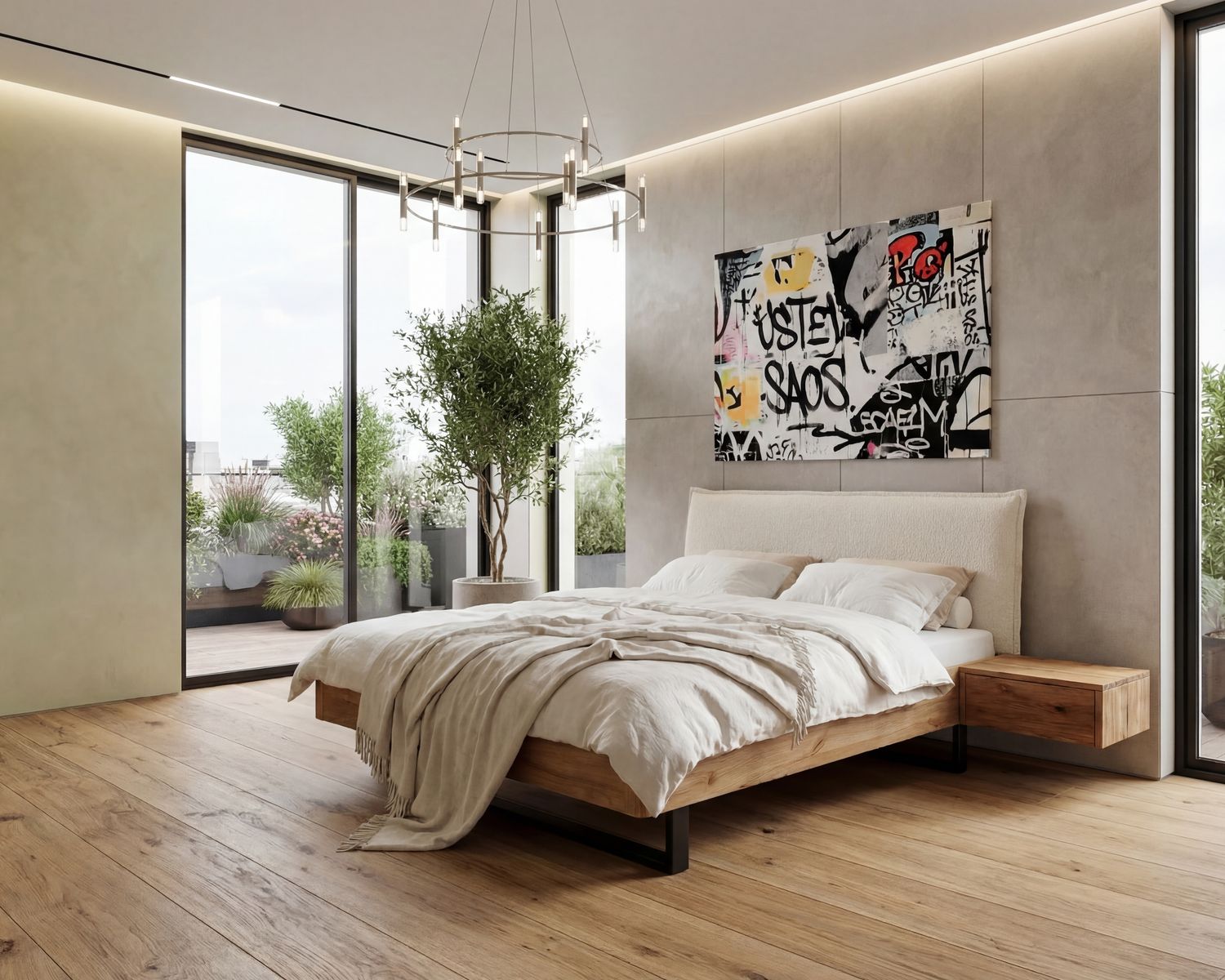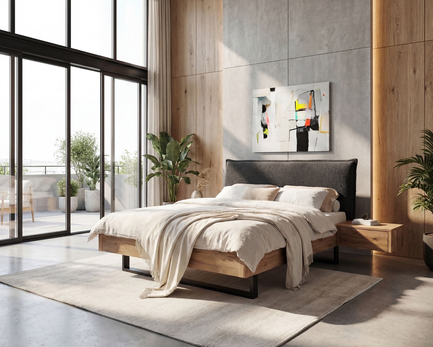 Um die kraftvolle Präsenz von Metall und Wildeiche sanft aufzufangen, haben wir dieses Bett mit dem Polsterkopfteil "Contour" kombiniert. Der angesagte Bouclé-Stoff mit seiner charakteristischen, unregelmäßigen Oberfläche ist nicht nur ein haptisches Erlebnis, sondern bringt sofortige Gemütlichkeit in den Raum.