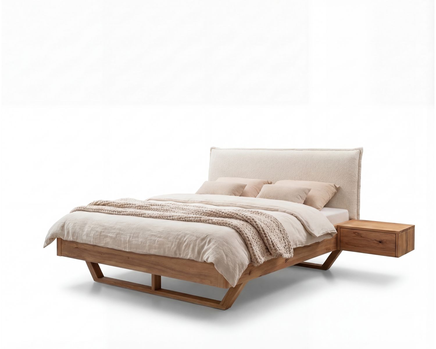 Um die massive Präsenz der Wildeiche sanft aufzubrechen, haben wir dieses Bett mit dem Polsterkopfteil "Contour" kombiniert. Der angesagte Bouclé-Stoff mit seiner charakteristischen, unregelmäßigen Oberfläche ist nicht nur ein haptisches Erlebnis, sondern auch optisch ein Highlight.