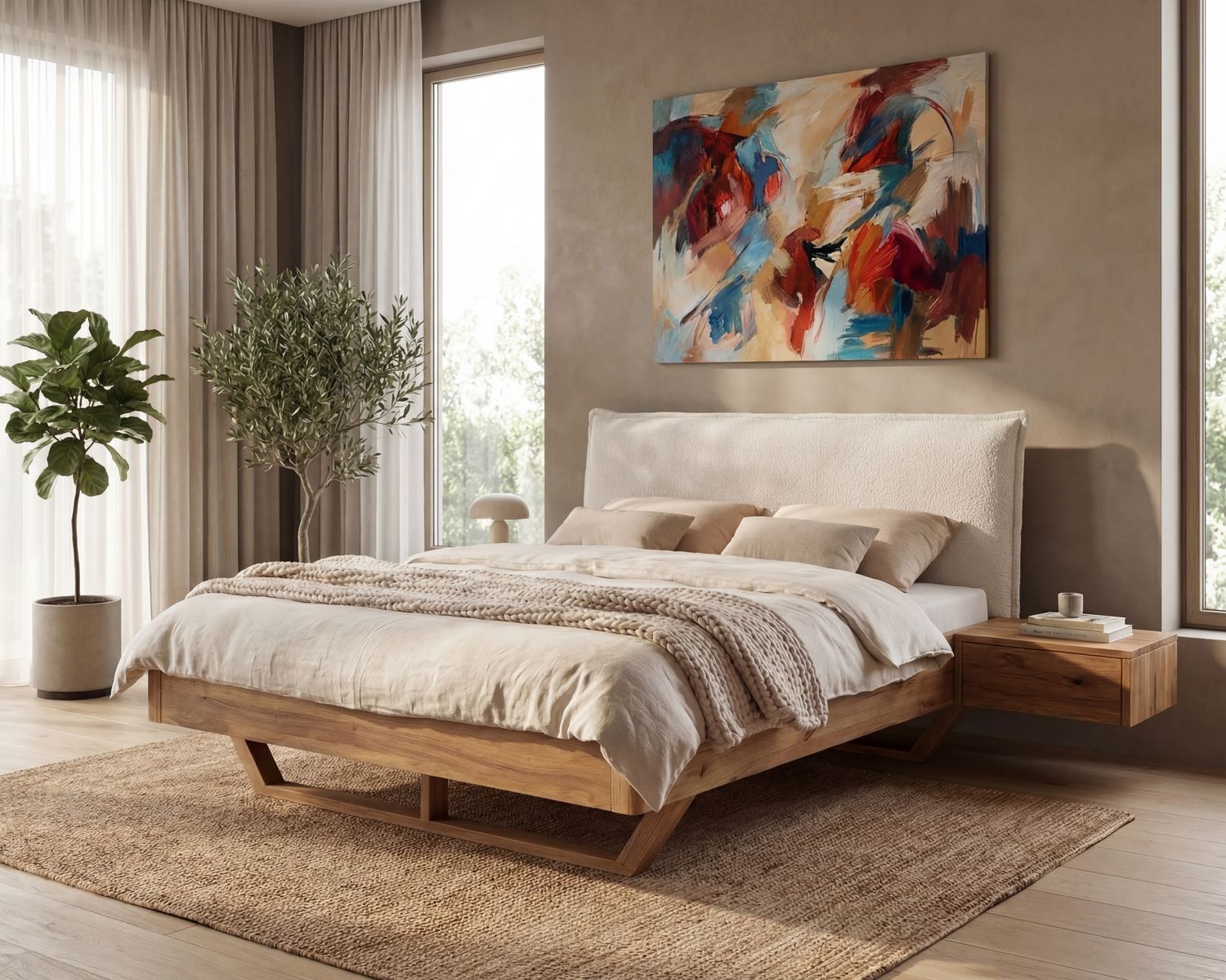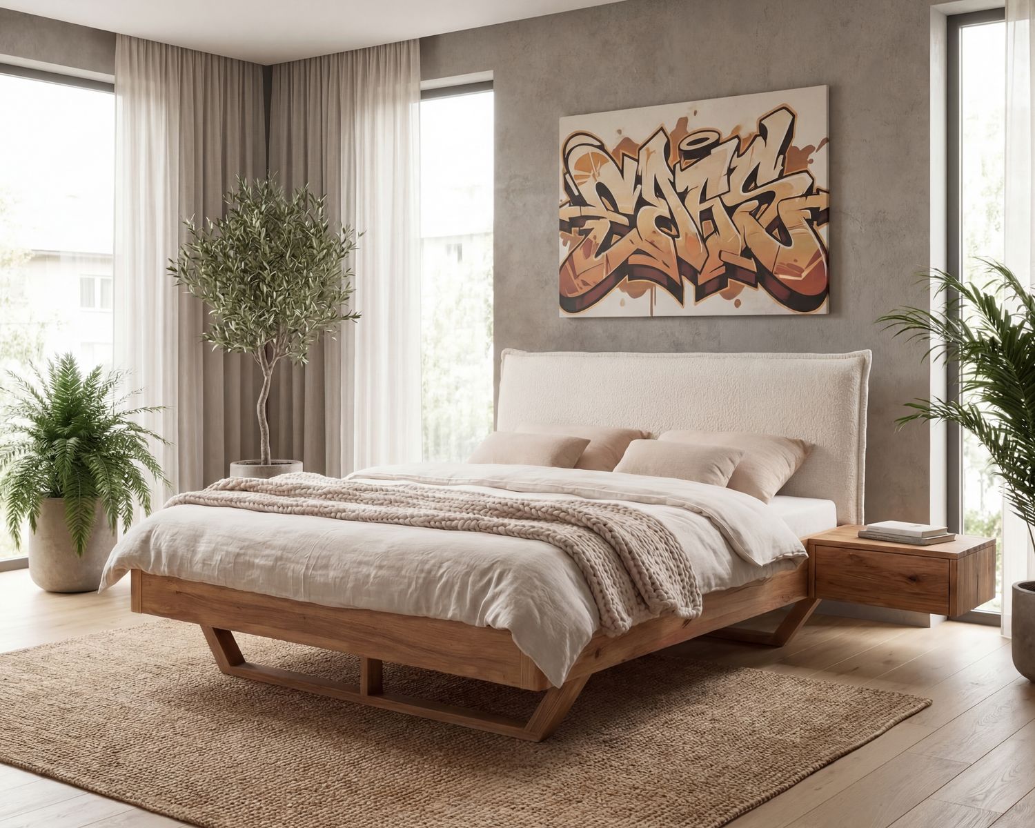 Bei diesem Modell haben wir bewusst auf kühles Metall verzichtet. Stattdessen ruht der massive Rahmen auf formschönen Holzkufen. Diese durchgängige Holzoptik verleiht Ihrem Schlafzimmer eine unvergleichliche Wärme und Ruhe. Die markante V-Form der Kufen sorgt dabei nicht nur für stabilen Stand, sondern erhält die beliebte, leichte Schwebeoptik.