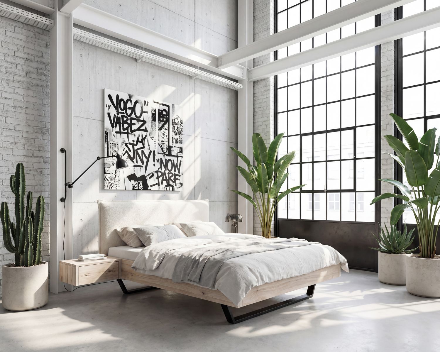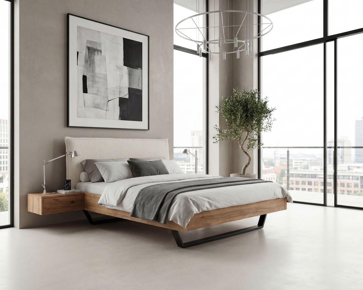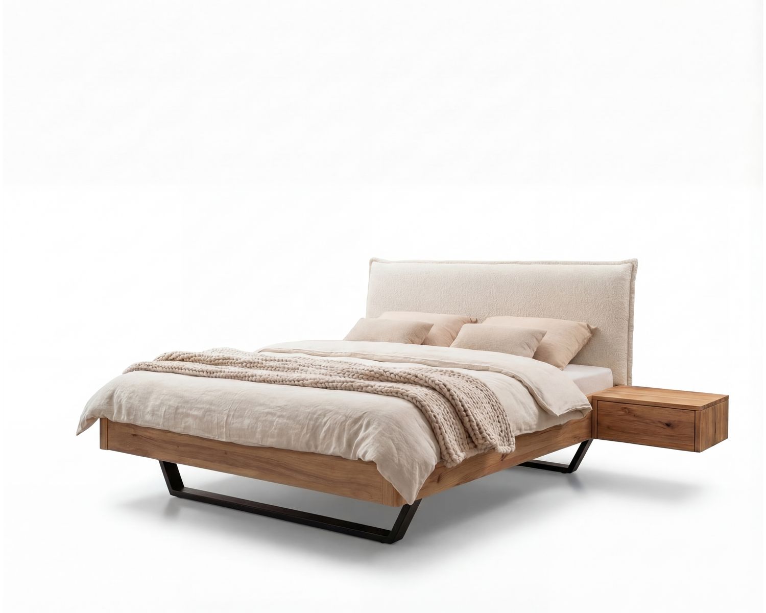 Der Star dieses Modells ist der Unterbau: Die massiven schwarzen Flachstahl-Kufen. Sie sind extrem flach gearbeitet und verleihen dem Bett eine geradlinige, fast architektonische Eleganz. Anders als bei geschwungenen Kufen steht hier die klare Kante im Vordergrund – perfekt für einen modernen, minimalistischen Wohnstil oder den angesagten Loft-Look.