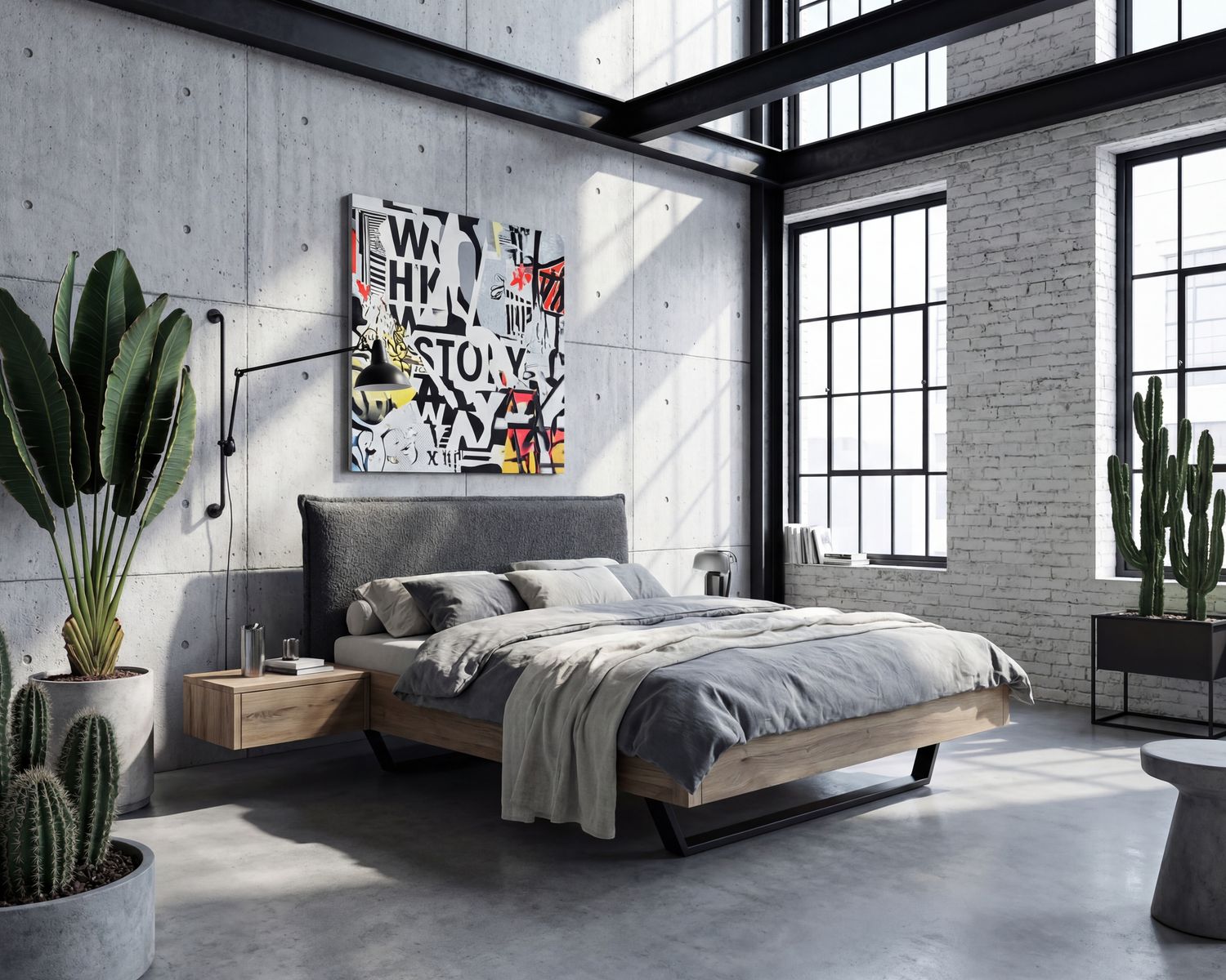 Dieses Bett lebt von seinen Kontrasten. Das kühle, schwarze Metall trifft auf das warme Massivholz und wird durch das weiche Polsterkopfteil "Contour" perfekt ausbalanciert.