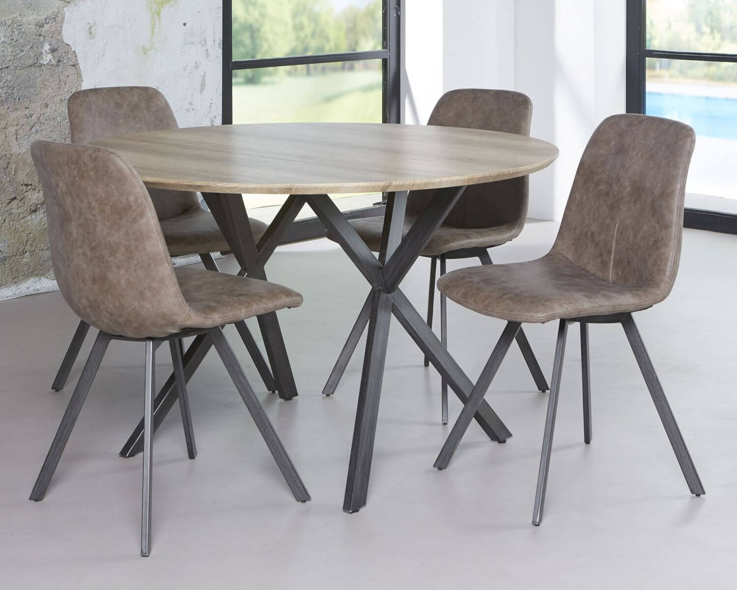 Dieser runde Esstisch Faria hat eine Tischplatte aus MDF mit einer 3D-Eichenfolie und wird von einem Stahlrahmen getragen. Dieser verleiht dem Tisch einen harten Charakter.