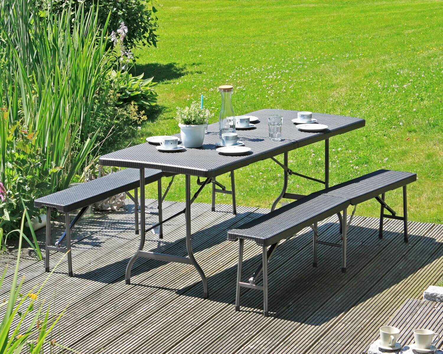 Mit diesem schönen klappbaren Tisch-Set Vantana werden Sie schöne Stunden im Garten verbringen. Das graue 3-teilige Tisch-Set ist in Rattan-Optik gehalten und wird von einem Stahlgestell getragen.