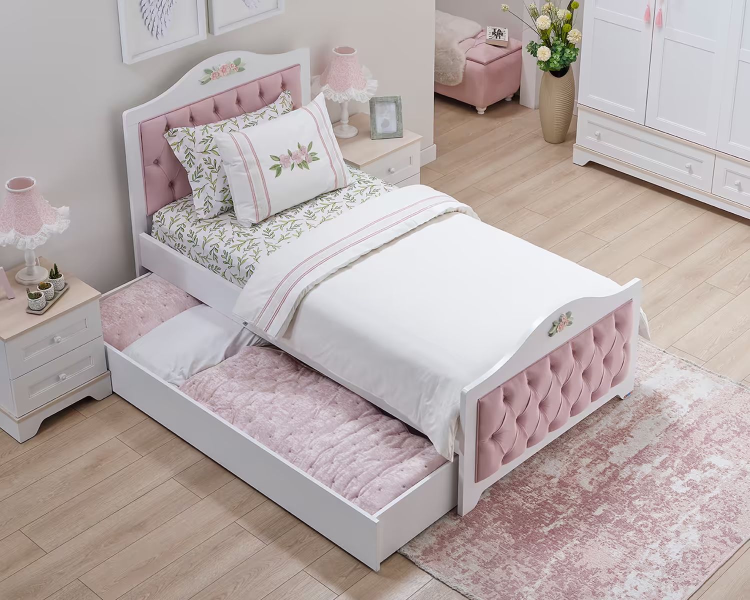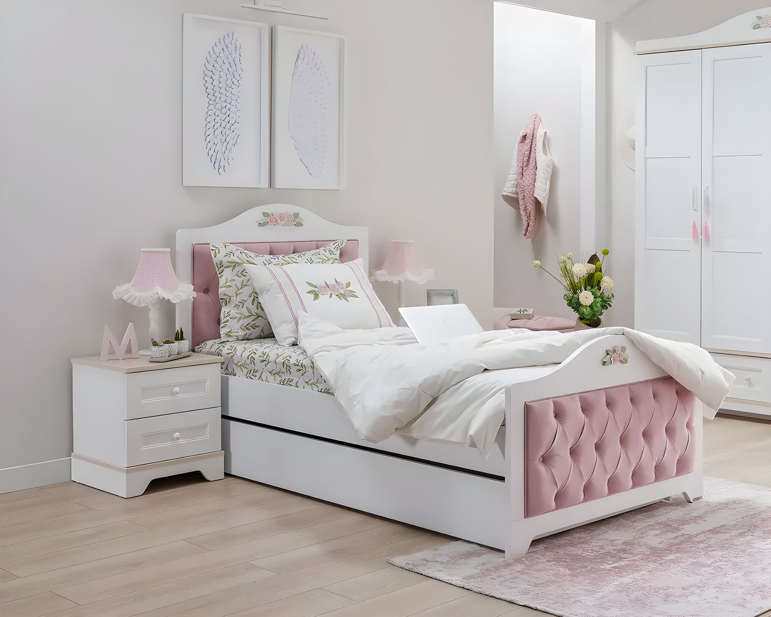 Das Polster fügt sich nahtlos in das Design des Bianca Bettes ein und schafft so ein harmonisches Gesamtbild im Kinderzimmer. Die zarte rosa Farbe wirkt beruhigend und fördert eine entspannte Atmosphäre, die ideal für einen erholsamen Schlaf ist. Gleichzeitig setzt sie einen stilvollen Akzent, der das Zimmer Ihres Kindes aufwertet und ihm eine persönliche Note verleiht.