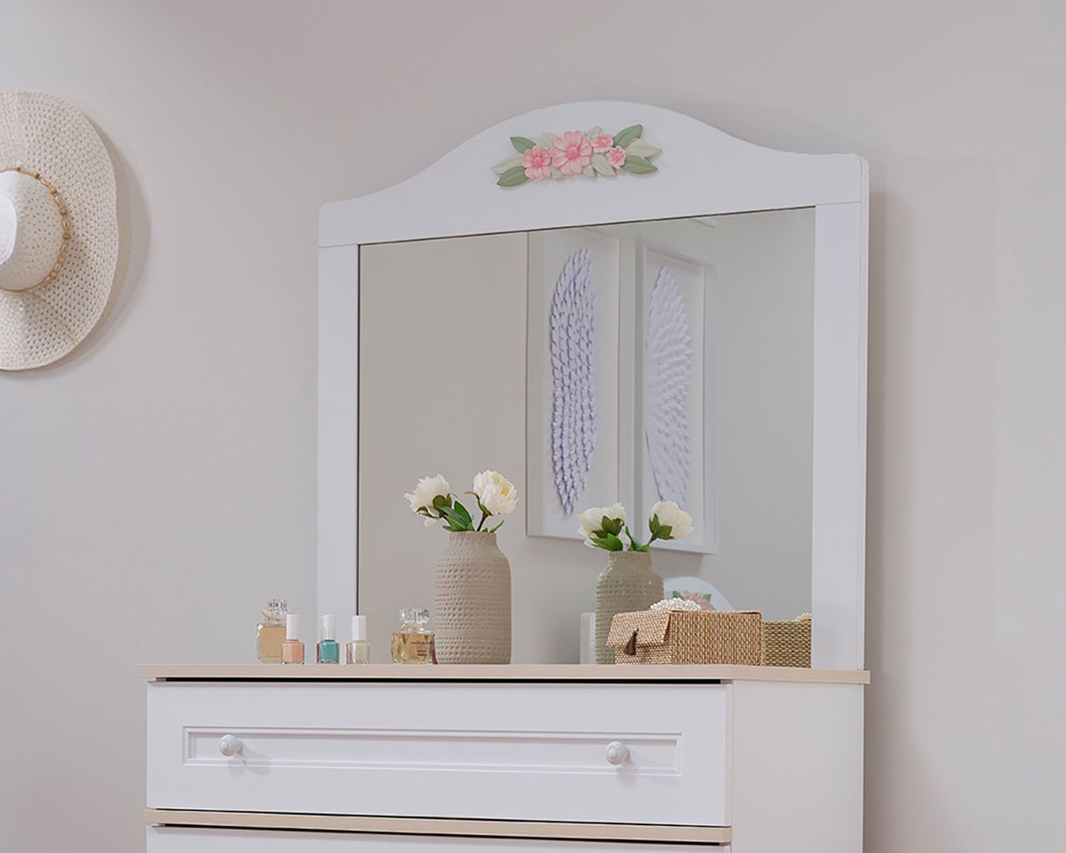 Der INFANSKIDS »Bianca« Spiegel besticht durch sein elegantes Design und die liebevoll gestalteten Details. Die weiße Farbe des Rahmens wird durch zarte Blumenverzierungen aus PU ergänzt, die dem Spiegel eine romantische Note verleihen. Diese kunstvollen Akzente machen ihn zu einem echten Blickfang in jedem Raum.
