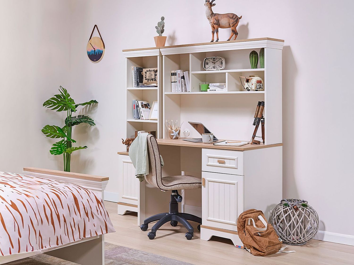 Mit seiner sanften Farbgebung in Cream und den stilvollen Akzenten in Eicheoptik fügt sich der Schreibtisch harmonisch in jedes Kinderzimmer oder Büro ein.
