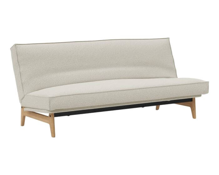 Das Schlafsofa Aslak steht auf einem Gestell aus matt schwarzem Stahl und auf massiven Füßen aus Eiche, was einen hervorragenden Kontrast erzeugt.