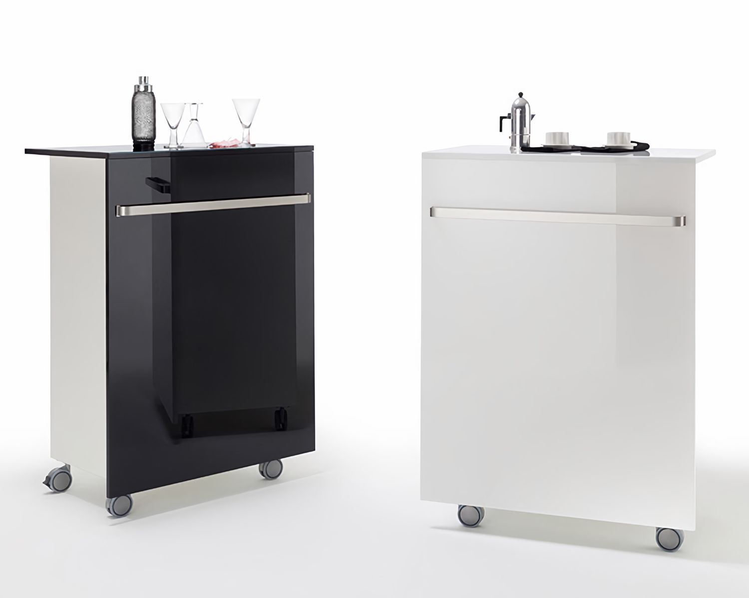 Die Theke ist in den Farben Schwarz und Weiß erhältlich und wird mit 4 Design-Lenkrollen geliefert, damit Sie mit dieser Theke auch sehr mobil sind.