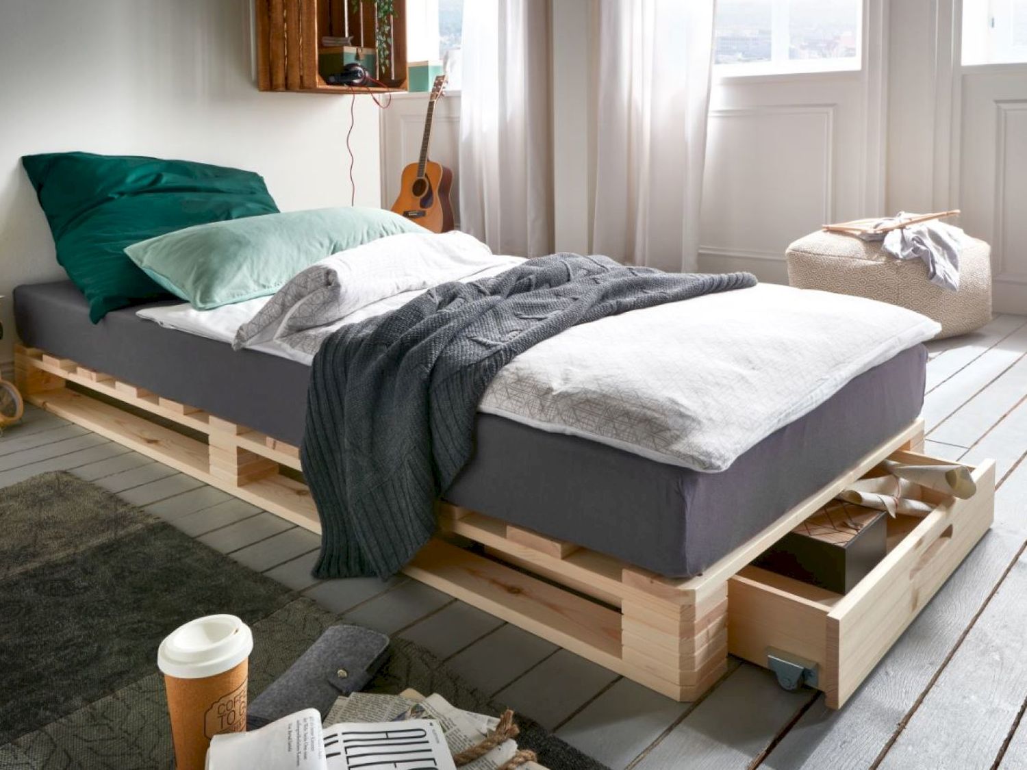 Zum Ausstattungsumfang zählen passende Lattenleisten und abhängig von der Breite ein oder zwei herausziehbare Schubladenelemente. Diese bieten ausreichend Stauraum für Bettwaren, Schlafbekleidung und weitere Dinge.