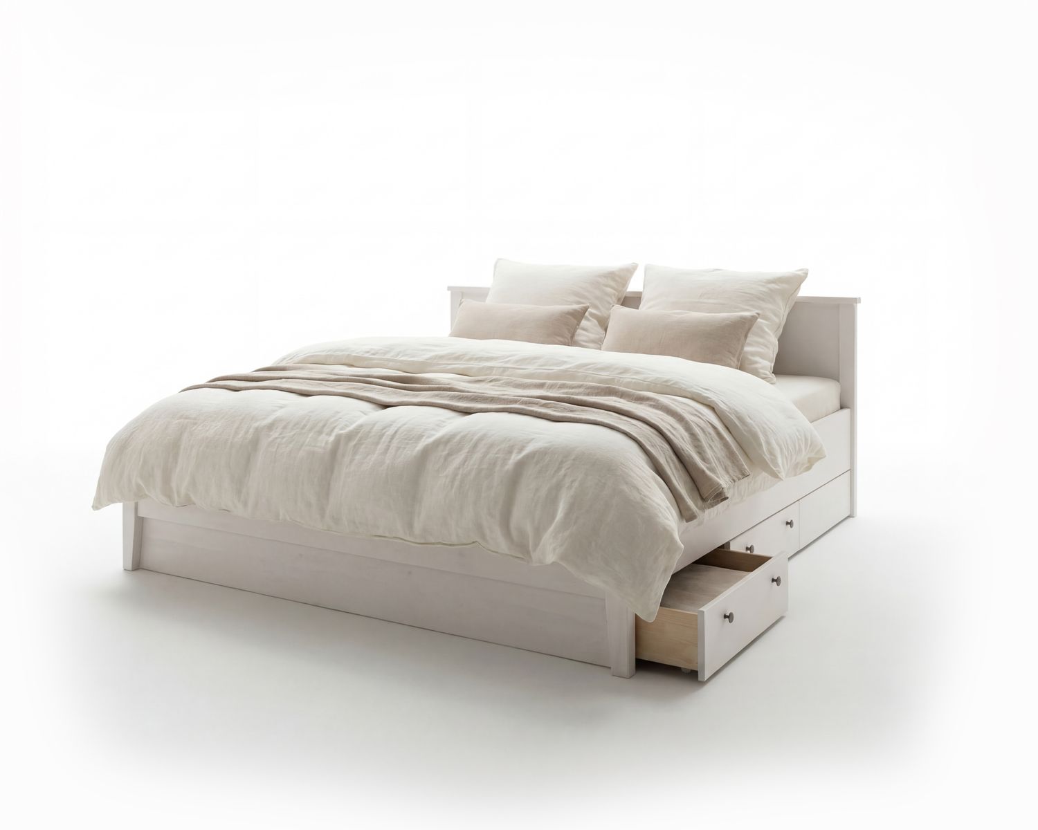 Die Massivholzbetten im Landhausstil sind aus massiver Kiefer gefertigt und in Weiß gewachst sowie in vier unterschiedlich großen Liegeflächen erhältlich. Wahlweise kann das Bett Solvita mit drei, sechs oder keinen Bettschubladen bestellt werden. Bei einer Bestellung mit Bettschubladen ist eine Blende für Kopf und Fußteil inklusive.