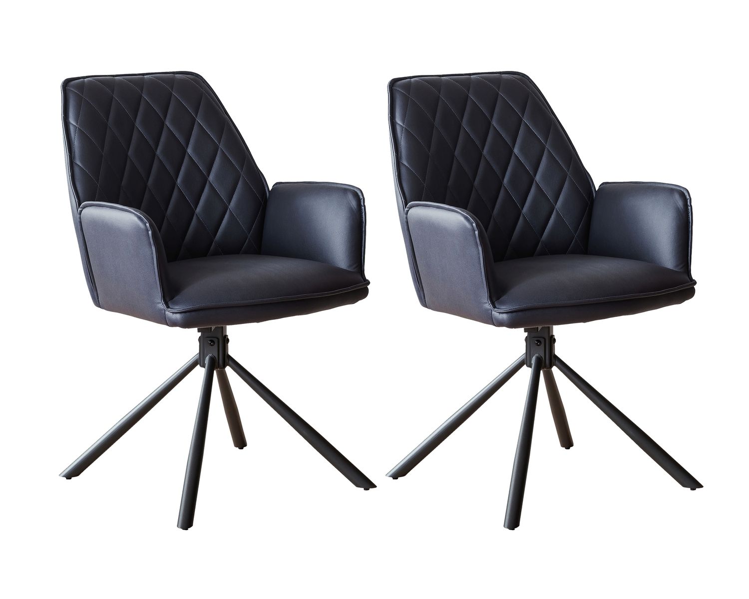 Die Armlehnstühle überzeugen durch die funktionale 360 Grad Drehfunktion. Der Microfaser-Bezug in Kunstlederoptik sieht sehr edel aus und passt perfekt zu den schwarzen Beinen. Das 4-beinige Metallgestell gewährleistet einen sicheren und stabilen Stand. Der Polsterstuhl bietet durch seine sesselartige Sitzfläche einen Sitzkomfort der Extraklasse. Die Rautensteppung auf der Rückenlehne ist eine Augenweide und macht dieses Möbel zum absoluten Blickfang in Ihrem Wohnraum.