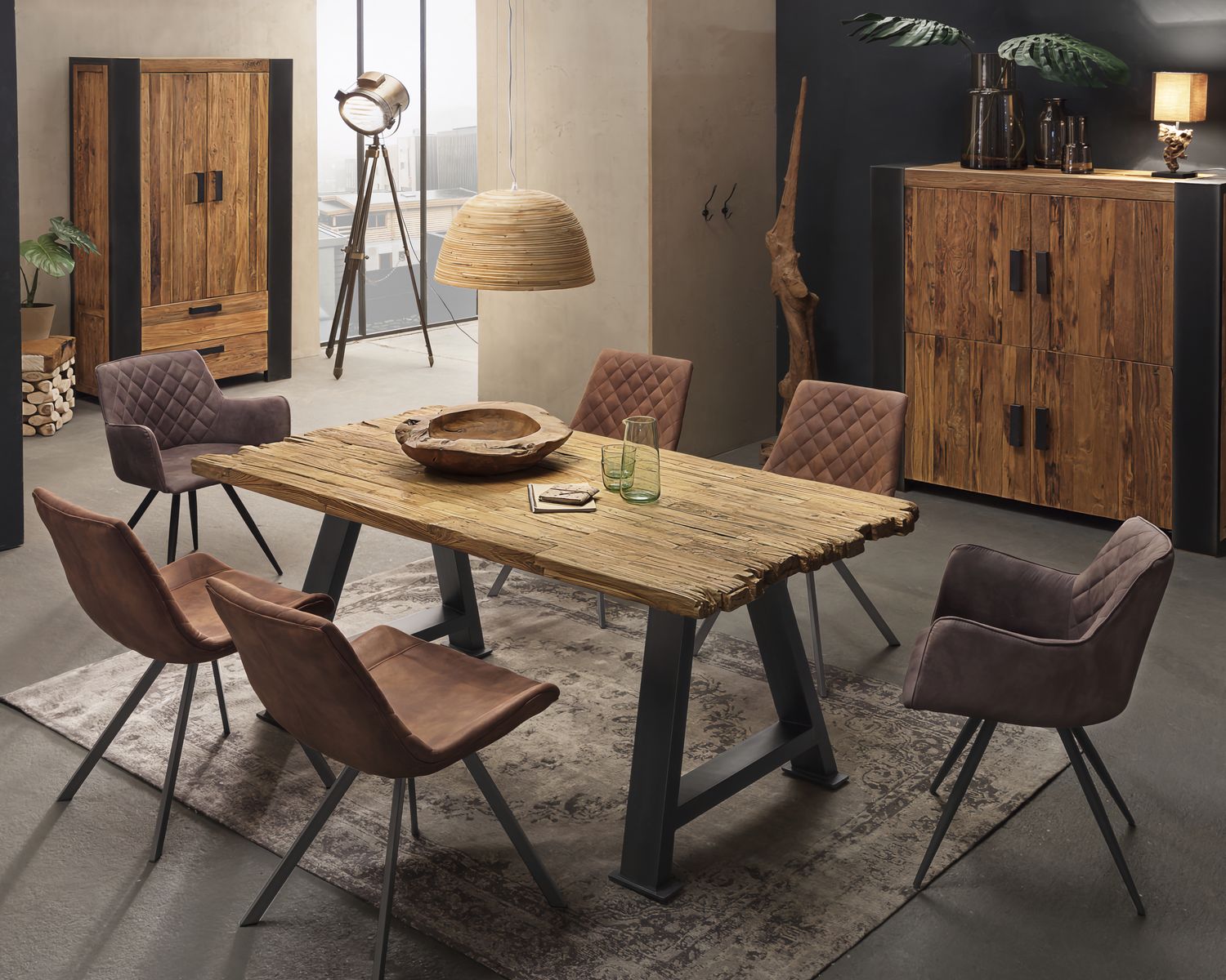 Der massive Teakholz Esstisch steht auf Metallkufen und beeindruckt vor allem mit der unebenen und naturbelassenen Tischplatte aus hochwertigem Teakholz..