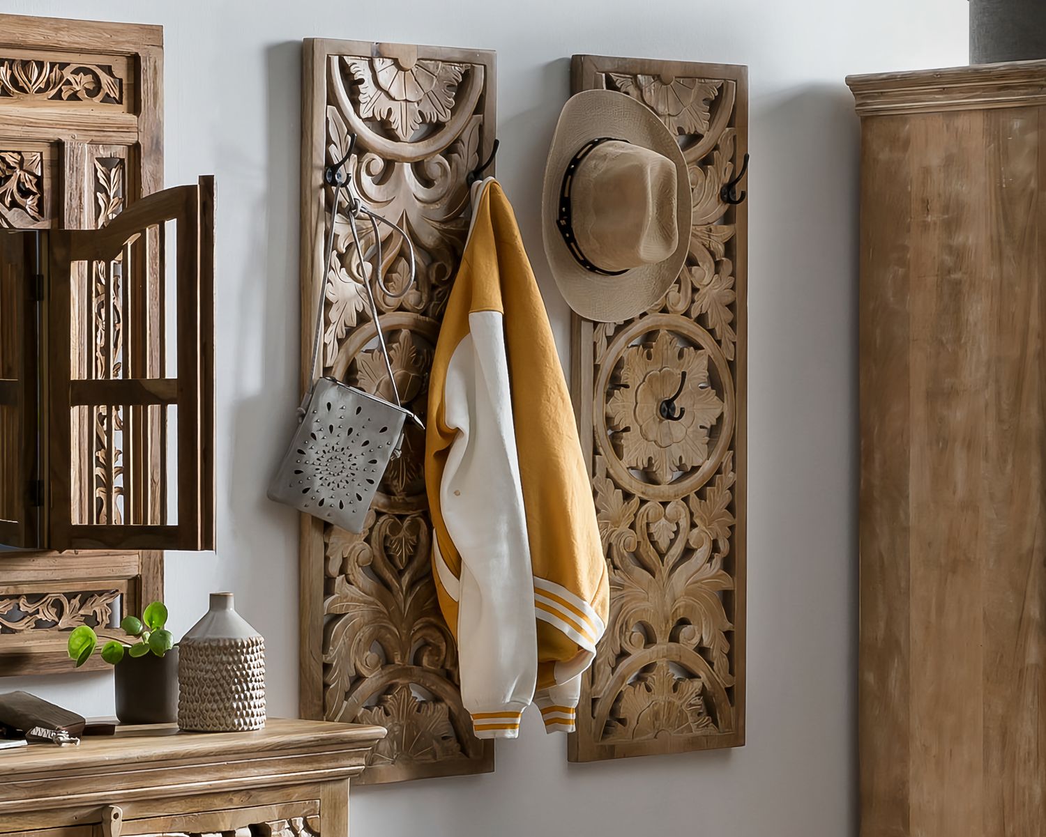 Holen Sie sich nicht nur Ordnung in den Eingangsbereich, sondern auch einen Hauch Exotik. Das Garderoben-Set bestehend aus einem Schuhschrank, 2 praktischen Garderobenpaneelen und einem Garderobenschrank, den Sie wahlweise mit 3 Einlegeböden oder einem Boden und einer Kleiderstange nutzen können, überzeugt mit Charakter und Einzigartigkeit. Angefertigt aus Mangoholz in einem warmen Naturton und mit aufwändigen Schnitzereien verziert, lädt der Stil zum Träumen ein. Dieses Dielen-Set kombiniert mit einem modernen Ambiente bietet einen zusätzlichen Blickfang.