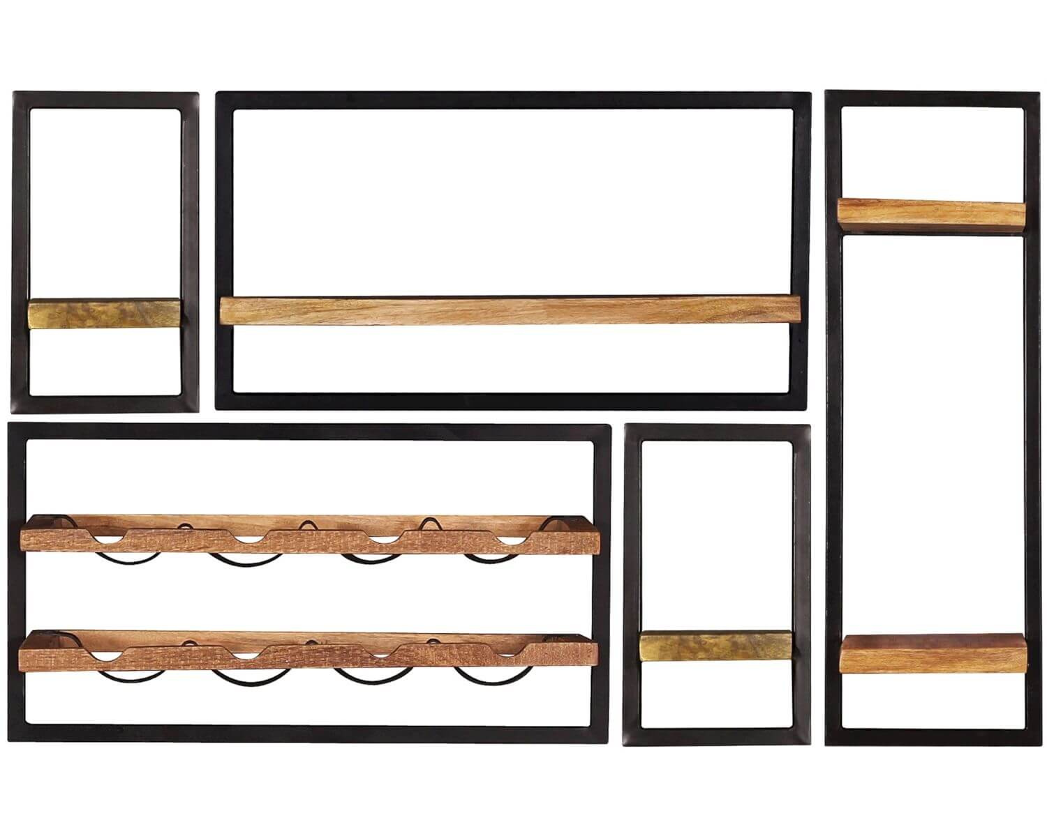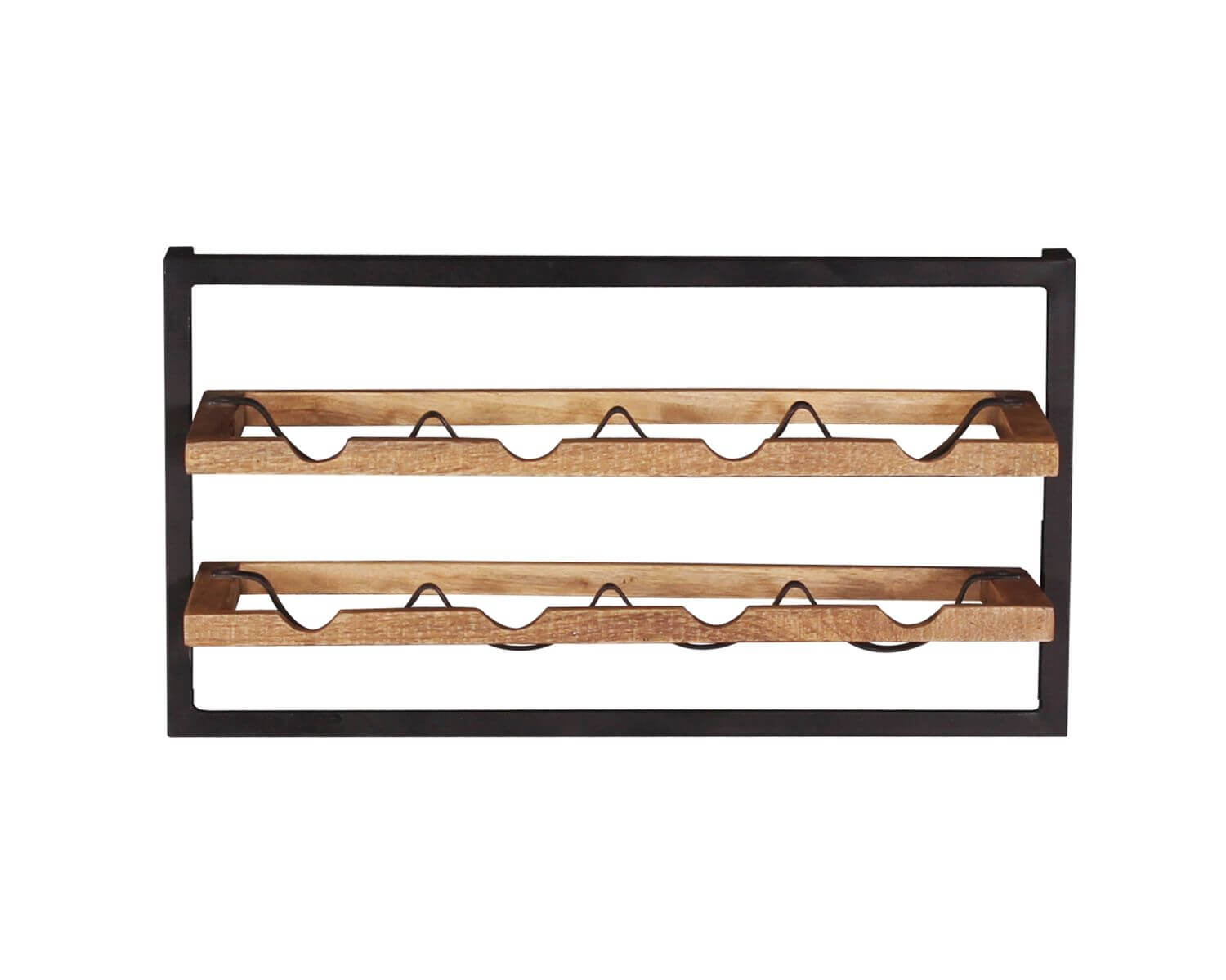 Mit diesem praktischen Weinregal aus naturfarbigem Mangholz mit antikschwarzem Metallrahmen können Sie 8 Weinflaschen gleichzeitig platzsparend und dekorativ an der Wand unterbringen. Die Kombination von mehreren Wandregalen erhöht die Kapazität und setzt der kreativen und individuellen Anordnung keine Grenzen. Der Materialmix von Holz in warmem Naturton und derben Metall liegt voll im Trend und sorgt für interessante Kontraste in der Optik und schafft eine wohnliche Atmosphäre.