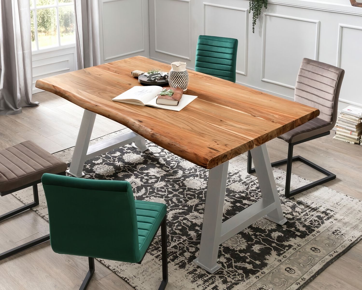 Modern und doch rustikal ist diese Esstisch Kombination. Die Esstischplatte sorgt für eine natürliche Note, während das Gestell modernen Flair versprüht.