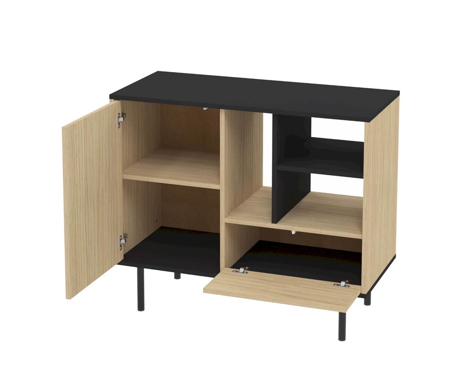 Zusätzlich bietet es drei offene Nischen und zwei mit Türen geschlossene Stauräume.