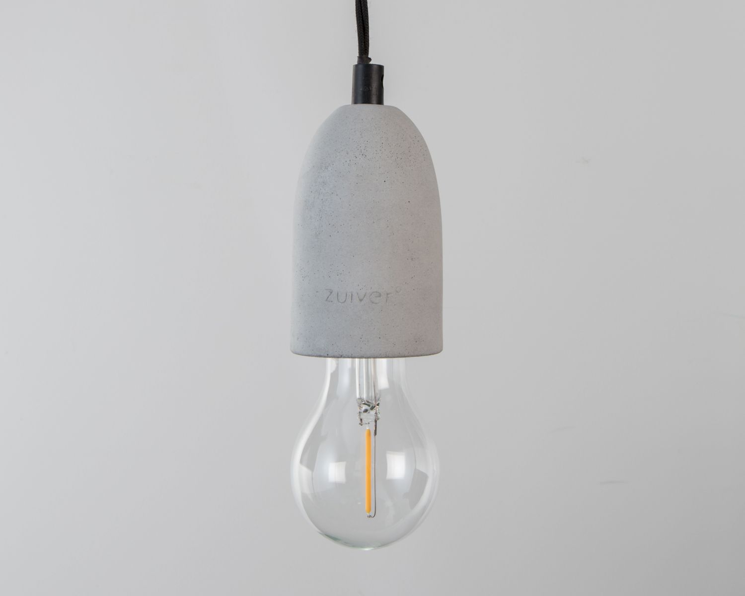 Ein gedrehtes Textilkabel ragt zur pulverbeschichteten schwarzen Eisenkappe an der Decke.